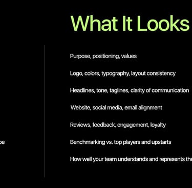 Audit Insight: A brand audit aligns your messaging across channels, ensuring your voice, tone, and positioning are crystal clear and consistent everywhere your brand shows up.